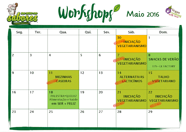 Com o mês de Abril completamente esgotado, publico já a agenda de Maio para que possam ver e sentir quais os wshops a que querem assistir. Em Maio terei 3 Iniciações ao Vegetarianismo, pois as inscrições são imensas e não posso deixar ninguém de fora com este tema tão importante e que tem mudado a vida de tanta gente.