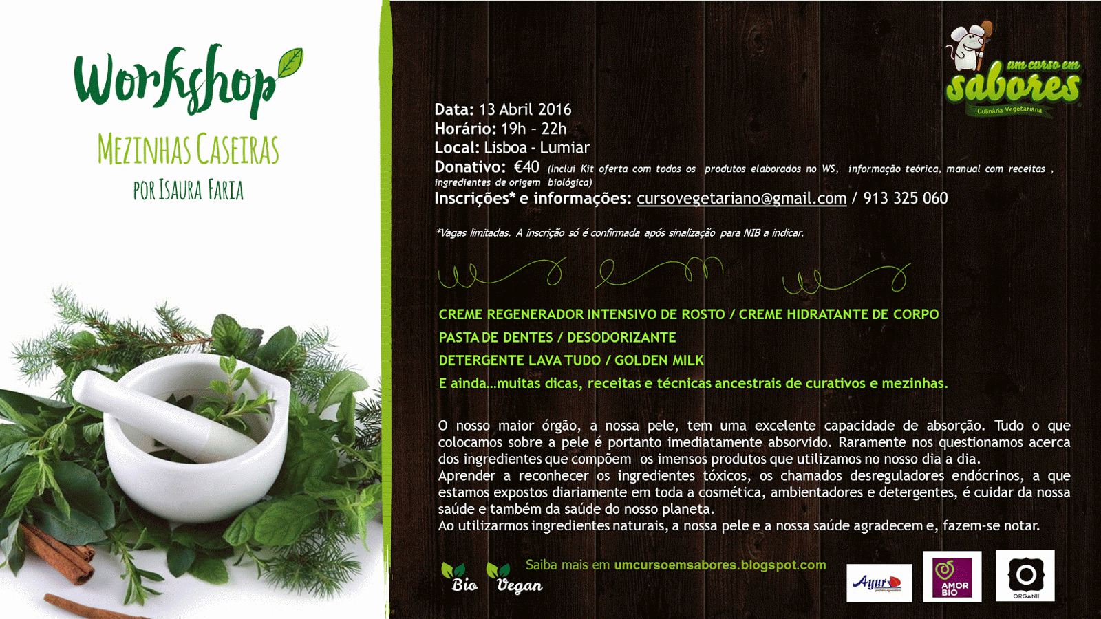 Donativo: 30€ (Inclui: parte teórica, manual com receitas,almoço incluído e ingredientes de origem biológica)