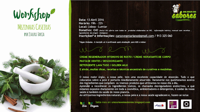 Donativo: 40€ (Inclui: kit oferta com todos os produtos elaborados no WS - creme regenerador intensivo de rosto, creme hidratante de corpo, pasta de dentes, desodorizante, pasta de curcúma para Golden MIlk e detergente lava tudo, informação teórica, manual com receitas e ingredientes de origem biológica ) Há sempre um mimo oferecido pela Organii, Cosmética Biológica. Serão ensinados também, detergente de roupa e pó solto para maquilhagem.