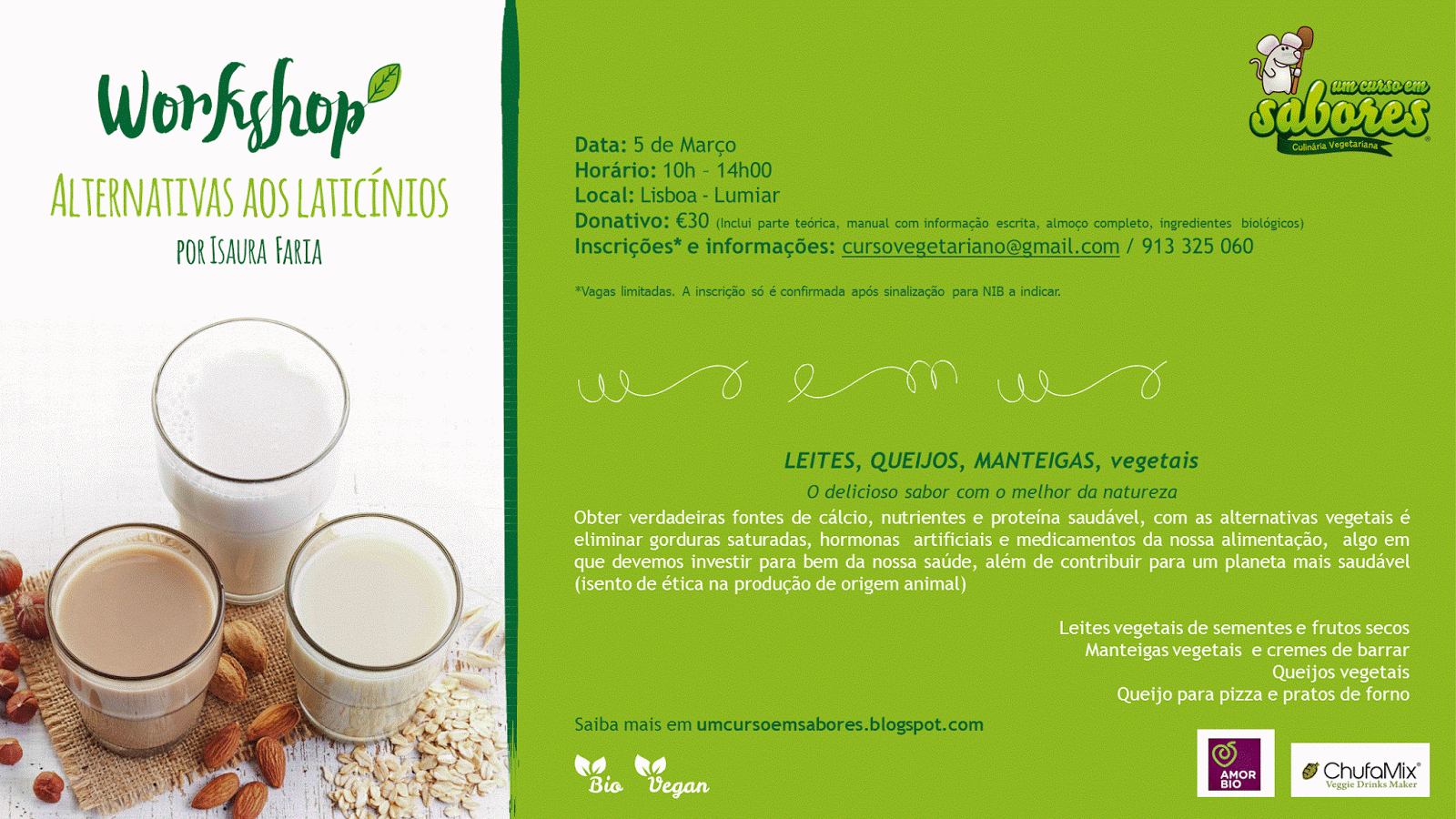 Donativo: 30€ (Inclui: parte teórica, manual com receitas, degustação de todas as receitas e ingredientes de origem biológica - almoço incluído)