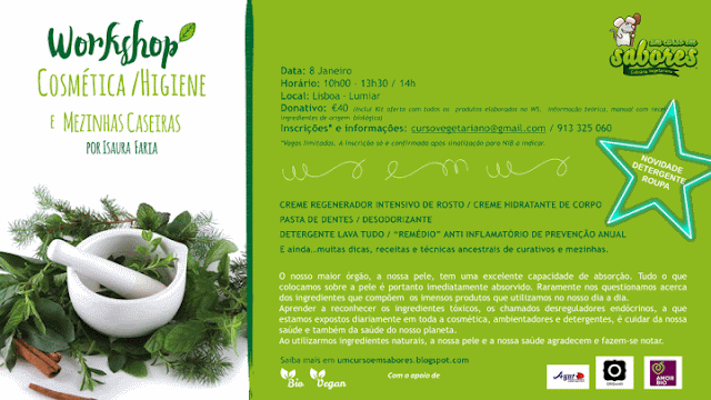 Donativo: 40€ (Inclui: kit oferta com todos os produtos elaborados no WS - creme regenerador intensivo de rosto, creme hidratante de corpo, pasta de dentes, desodorizante, pasta de curcúma para Golden MIlk e detergente lava tudo, informação teórica, manual com receitas e ingredientes de origem biológica ) Há sempre um mimo oferecido pela Organii, Cosmética Biológica. Serão ensinados também, detergente de roupa e pó solto para maquilhagem.