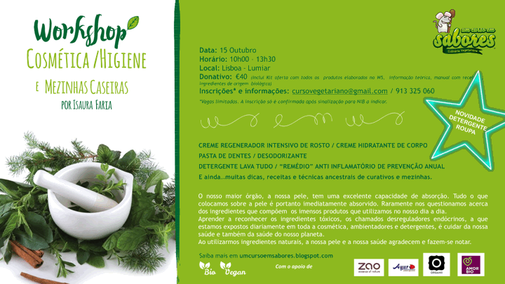 Donativo: 40€ (Inclui: kit oferta com todos os produtos elaborados no WS - creme regenerador intensivo de rosto, creme hidratante de corpo, pasta de dentes, desodorizante, pasta de curcúma para Golden MIlk e detergente lava tudo, informação teórica, manual com receitas e ingredientes de origem biológica ) Há sempre um mimo oferecido pela Organii, Cosmética Biológica. Serão ensinados também, detergente de roupa e pó solto para maquilhagem.