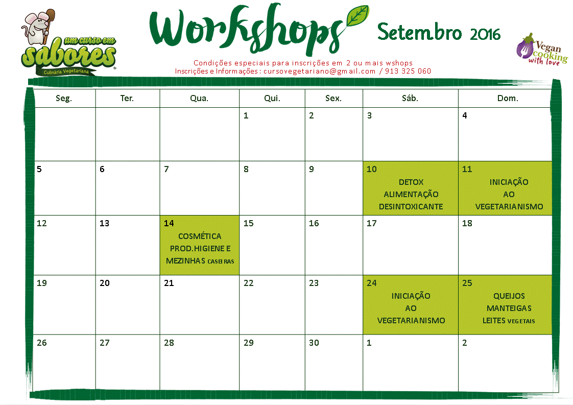 A Agenda detalhada de Setembro estará disponível ainda esta semana mas podem ir já vendo os wshops que vou ter. vai haver uma redução de valor para quem frequentar 2 ou mais wshops durante o mesmo mês.